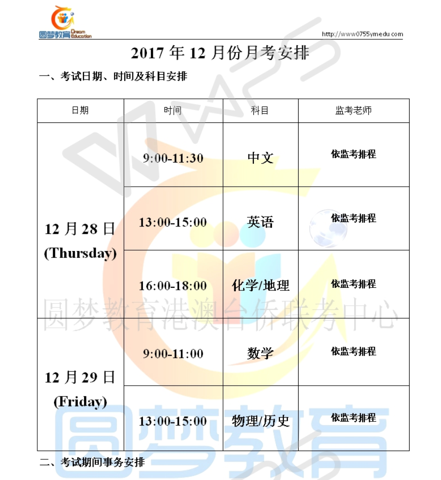 为了更好地考查各位同学在近阶段的学习状况以及老师们的教学进程和授课水平,真正地实现共同进步,圆梦教育华侨港澳台联考培训中心将于2017年12月28日、29日举行高三第四次月考,现将具体细节事项公告如下: